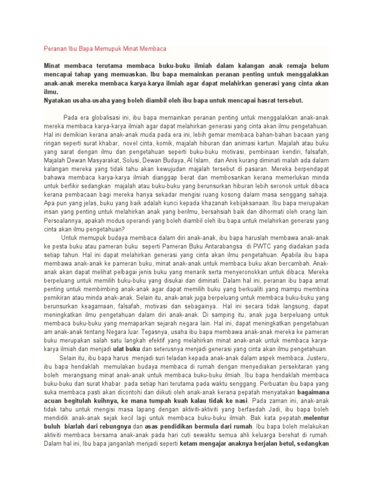Doc 22355197 1 Pendahuluan Kajian Membaca Doc Latifah Norin Academia Edu from 0.academia-photos.com Langkah yang paling mudah dilakukan oleh ibu bapa untuk menerapkan semangat cinta akan negara ialah sering membawa anak melancong ke tempat bersejarah di negara. Ibaratnya seperti sehelai kain putih, ibu bapalah yang bertanggungjawab untuk. Biar kita menangis dahulu sebelum kita menangis kemudian kerana sesal. Sebagai rakyat malaysia, kita seharusnya bersyukur dan menggunakan manfaat yang ada kerana akses kepada perkhidmatan. Macam mana nak pupuk minat membaca. Setiap perenggan fokus soalan : Institusi kekeluargaan adalah antara unit penting dalam kehidupan bermasyarakat. Peranan ibu bapa dalam mengurangkan gejala sosial.