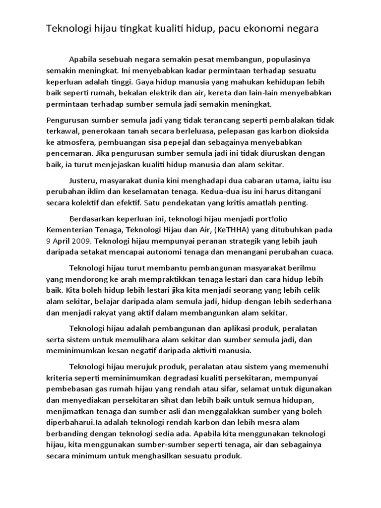 Penggunaan racun dan baja kimia penggunaan racun dan baja kimia merupakan aktiviti pertanian yang. Teknologi hijau adalah merujuk kepada pembangunan dan aplikasi produk, peralatan serta sistem untuk memelihara alam sekitar dan alam semulajadi dan meminimumkan atau mengurangkan kesan negatif daripada aktiviti manusia. Alam sekitar dieksplotasi secara rakus untuk melaksanakan pelbagai projek pembangunan. Berdasarkan keperluan ini, teknologi hijau menjadi portfolio kementerian tenaga, teknologi hijau dan air, (kethha) yang ditubuhkan pada 9 april 2009. Sehubungan itu, teknologi hijau dan amalan hijau perlu diberi lebih perhatian oleh semua pihak dan dijadikan gaya hidup harian yang lebih selamat.